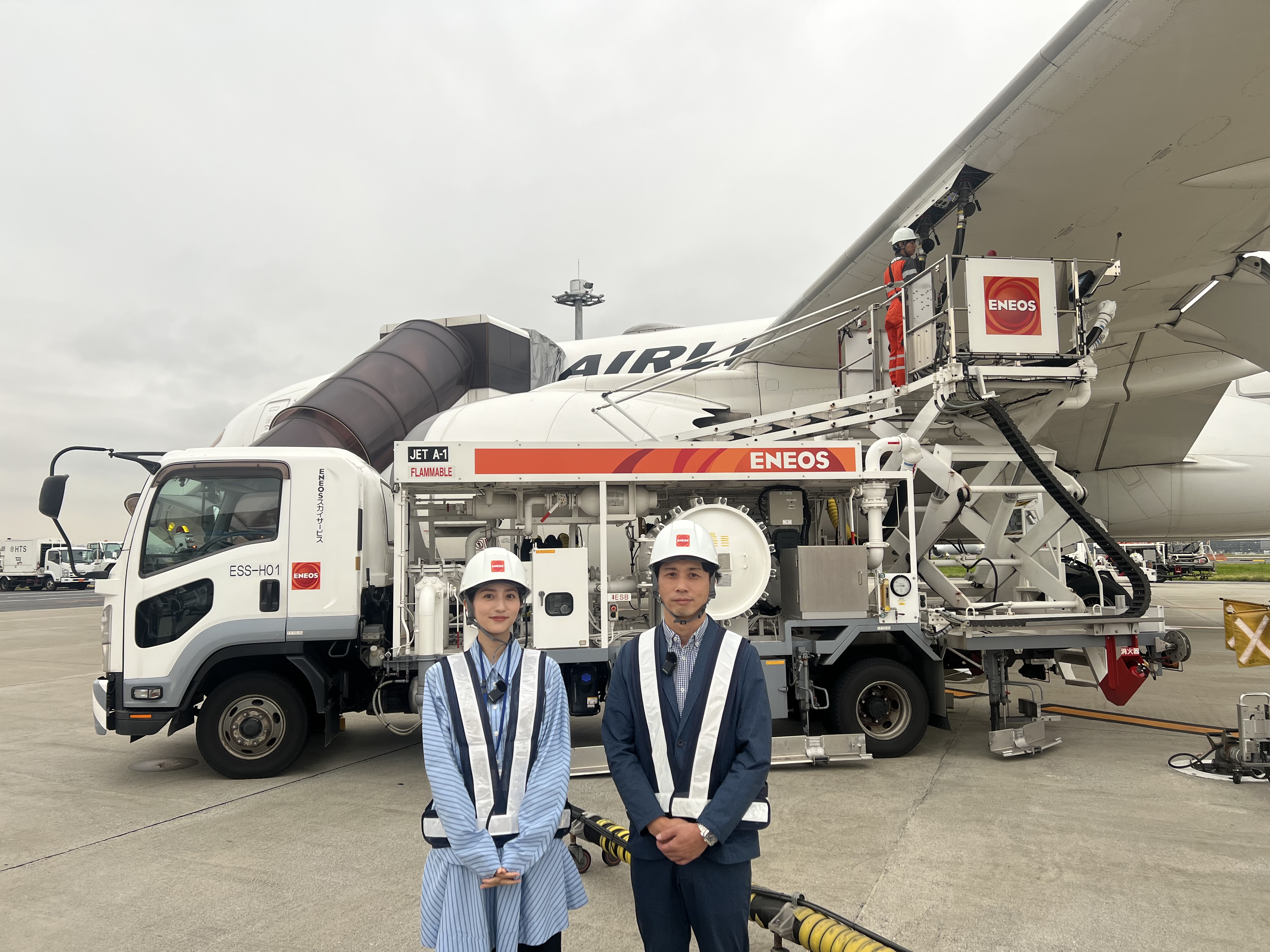 航空機への給油シーンをバックに、堀田茜さん(左)と、ENEOSスカイサービス羽田事業所 副事業所長森さん(右)